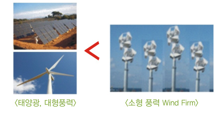 • 설치 점유면적이 동일 출력기준 태양광발전이나 프로펠러 발전기 갯수에 비해 1/3-1/4 수준임